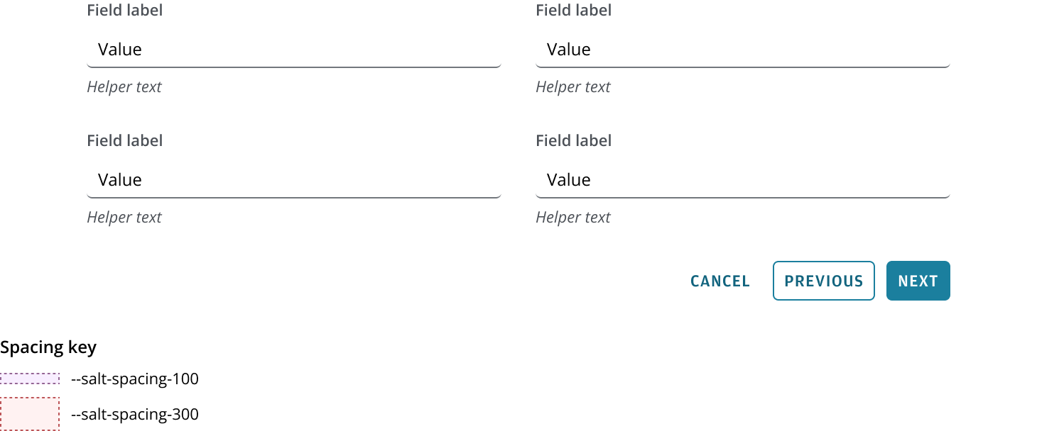 Spacing is a key tool for emphasizing certain elements while downplaying others, guiding users through content. We suggests using varied spacing (--salt-spacing-300, --salt-spacing-200, --salt-spacing-100) to establish a visual hierarchy. Consistent vertical separation of items like headings, text blocks, form elements, and cards creates a visual rhythm.